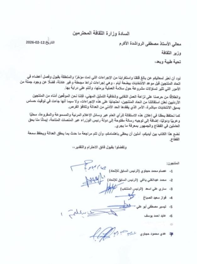 شهد الوسط الثقافي تصعيداً جديداً تمثل في تقديم مجموعة من أبرز أعضاء جمعية اتحاد المنتجين الأردنيين للإعلام استقالاتهم الجماعية، وذلك في أعقاب قرار بحل الهيئة الإدارية المنتخبة وإلغاء نتائج الانتخابات التي جرت في وقت سابق من عام 2025.
