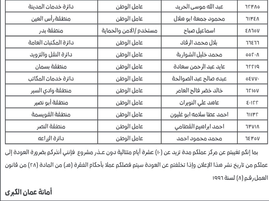 نيروز الإخبارية : وجّهت أمانة عمّان الكبرى، اليوم الأحد، إنذارًا لعدد من العمال والموظفين المتغيبين عن مواقع عملهم.