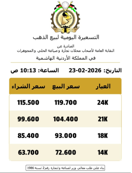 وحسب النشرة التي أصدرتها النقابة العامة لأصحاب محلات تجارة وصياغة الحلي والمجوهرات، بلغ سعر الغرام الواحد من الذهب عيارات 24 و 18 و 14 لغايات البيع من محلات الصاغة عند 119.70 و 93 و 72.60 دينار على التوالي.