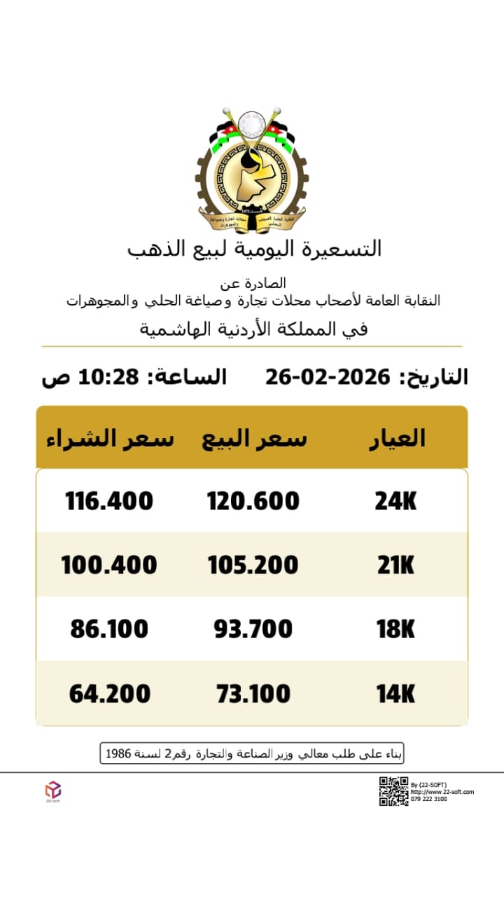 وحسب النشرة التي أصدرتها النقابة العامة لأصحاب محلات تجارة وصياغة الحلي والمجوهرات، بلغ سعر الغرام الواحد من الذهب عيارات 24 و 18 و 14 لغايات البيع من محلات الصاغة عند 120.60 و 93.70 و 73.10 دينار على التوالي.