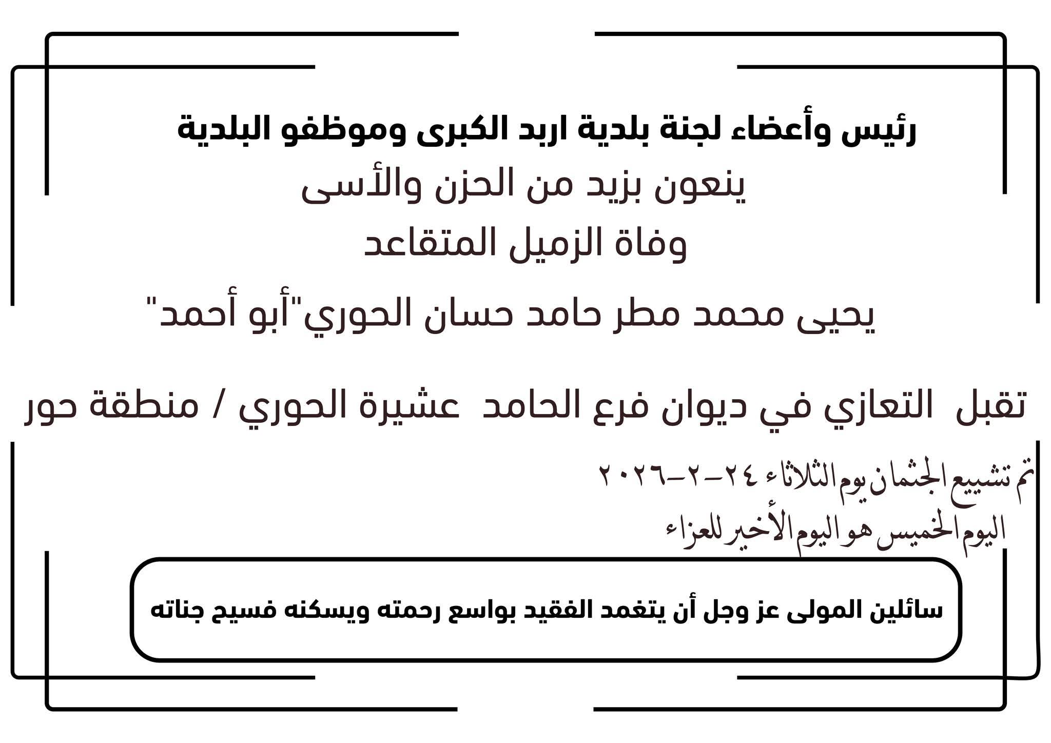 نعى رئيس وأعضاء لجنة بلدية إربد الكبرى وموظفو البلدية ينعون بمزيد من الحزن والأسى وفاة زميلهم المتقاعد يحيى محمد مطر حامد حسان الحوري"أبو أحمد".