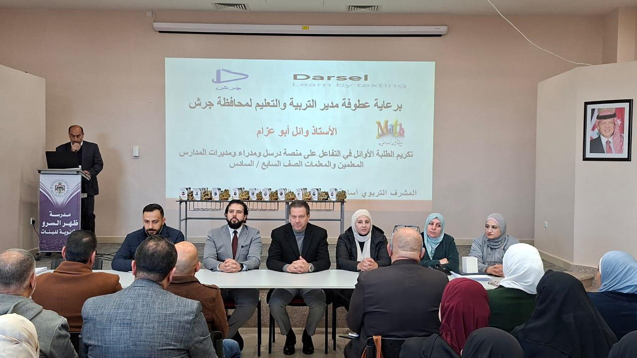 وجرى حفل التكريم على مسرح مدرسة ظهر السرو الثانوية للبنات، بحضور مديرة الشؤون التعليمية نسرين عتوم، ورئيس قسم الإشراف التربوي الدكتورة نجود الفريحات، ومدير منصة "درسل” في الأردن الأستاذ محمد كنعان، وعدد من المشرفين التربويين والمعنيين بالمبادرة.