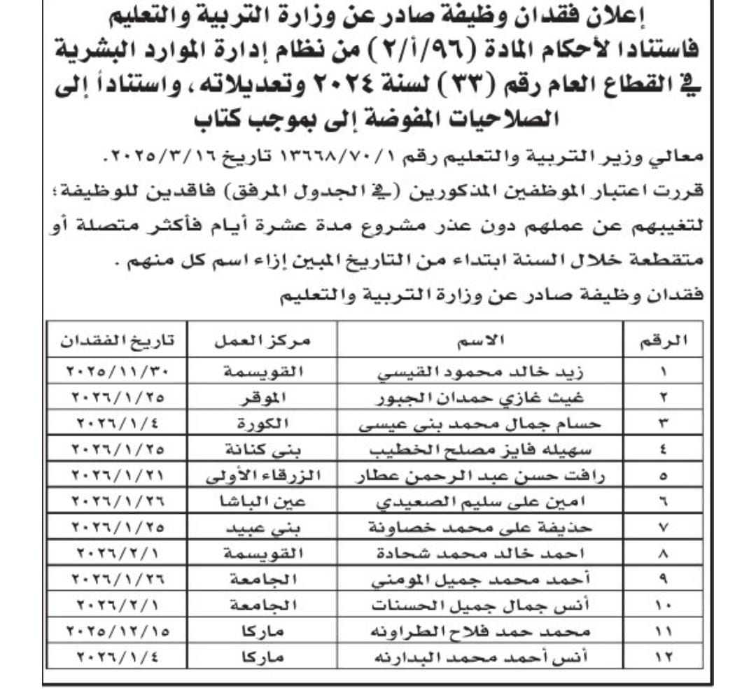 أعلنت وزارة التربية والتعليم الأردنية اليوم الاثنين عن فقدان عدد من الموظفين لوظائفهم، وذلك استنادًا إلى أحكام المادة (96/أ/2) من نظام إدارة الموارد البشرية في القطاع العام رقم (33) لسنة 2024 وتعديلاته.