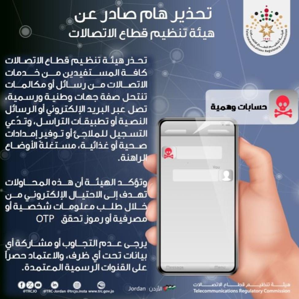 ودعت إلى عدم التجاوب أو مشاركة أي بيانات تحت أي ظرف، والاعتماد حصراً على القنوات الرسمية المعتمدة.