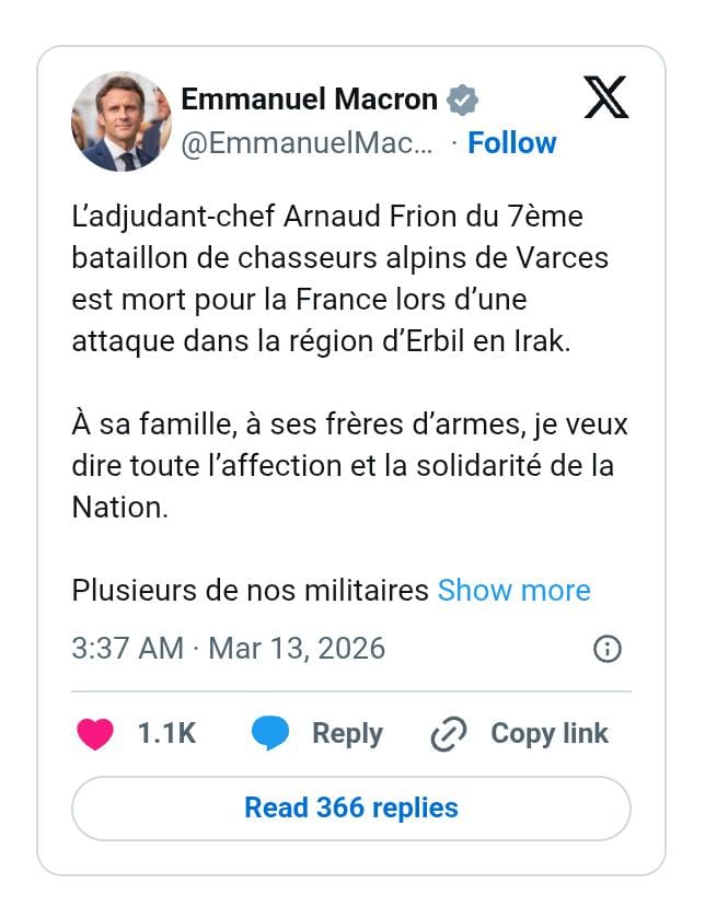 وكتب ماكرون على منصة "إكس": "استشهد الضابط أرنو فريون في سبيل فرنسا خلال هجوم في منطقة أربيل بالعراق. أتقدم بأحر التعازي وأصدق مشاعر التضامن من الشعب إلى عائلته ورفاقه في السلاح".