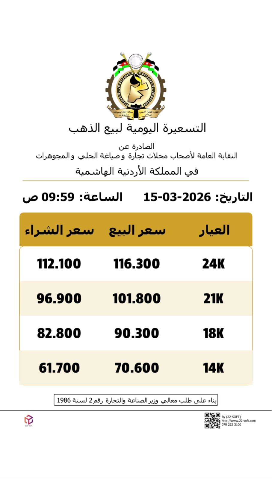 وحسب النشرة التي أصدرتها النقابة العامة لأصحاب محلات تجارة وصياغة الحلي والمجوهرات، بلغ سعر الغرام الواحد من الذهب عيارات 24 و18 و 14 لغايات البيع من محلات الصاغة عند 116.30 و 90.30 دينار، و70.60 دينار على التوالي.