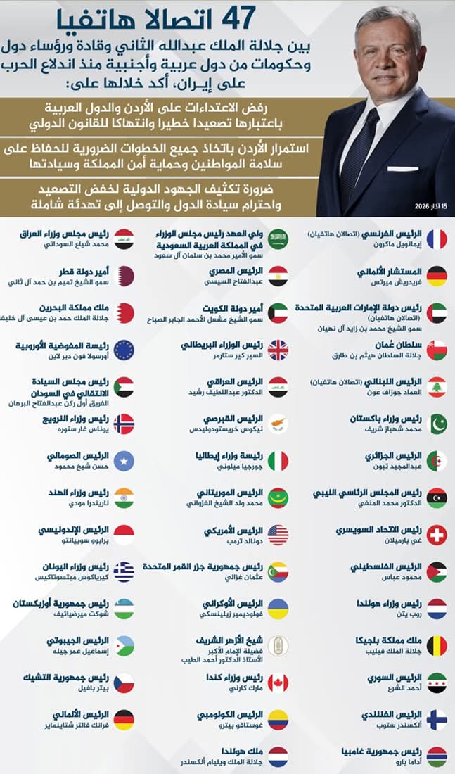 وتنشر وكالة الأنباء الأردنية (بترا)، على موقعها الإلكتروني ومنصاتها على مواقع التواصل الاجتماعي، انفوغرافا يوضح أسماء الزعماء وقادة الدول ورؤساء الحكومات الذين تلقى جلالة الملك الاتصالات منهم.