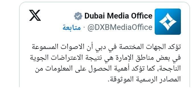 أكد الحساب الرسمي للمكتب الإعلامي لحكومة دبي، الثلاثاء، أن الاصوات المسموعة في بعض مناطق الإمارة هي نتيجة الاعتراضات الجوية الناجحة.