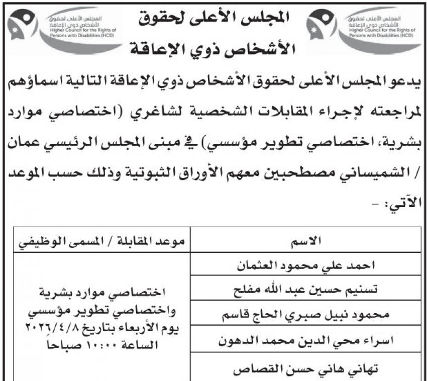 ودعا المجلس الاعلى لحقوق الأشخاص ذوي الإعاقة، التالية أسماؤهم لإجراء المقابلات الشخصية.