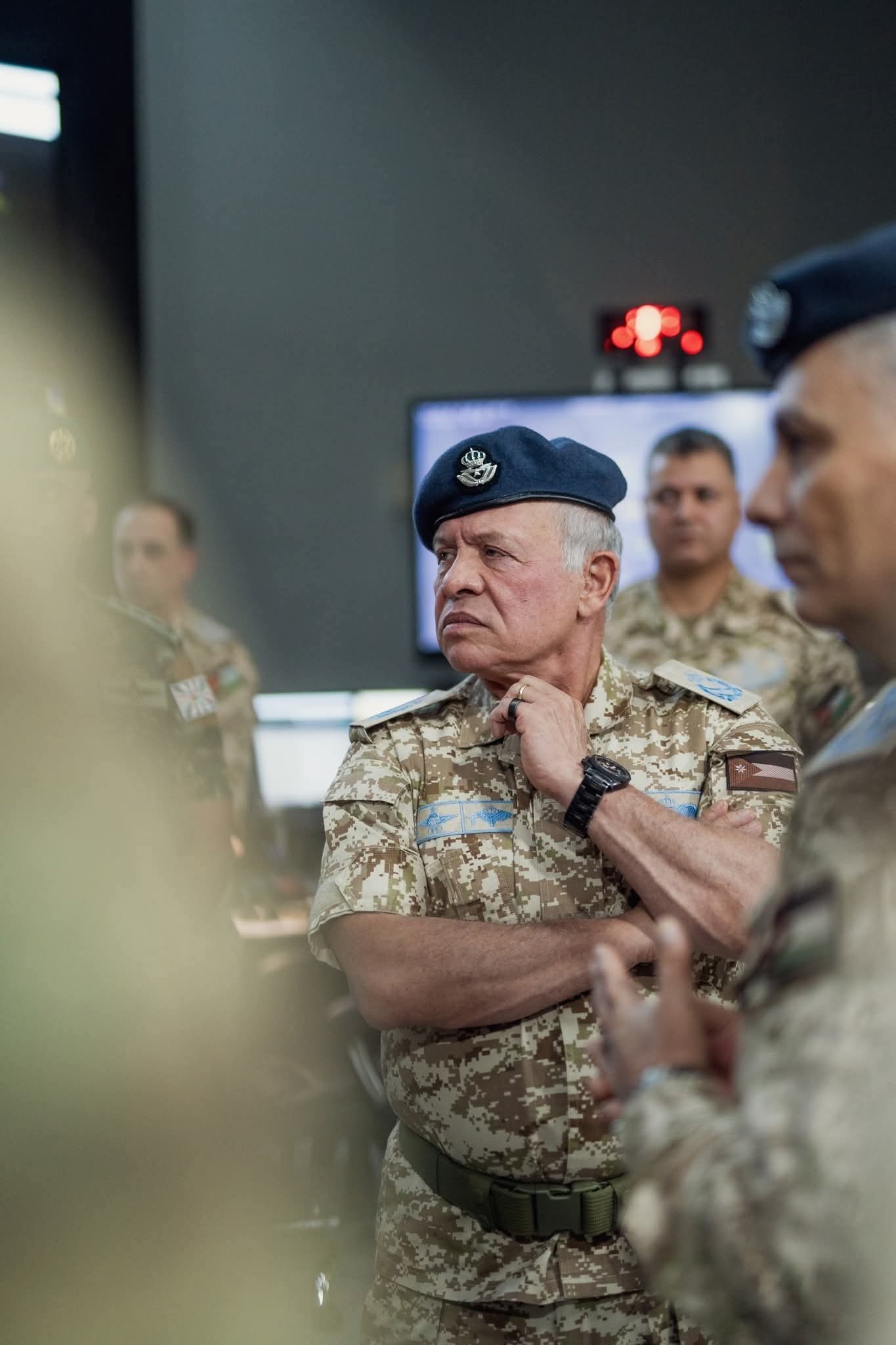 وجال جلالة الملك في مركز القيادة والسيطرة، حيث تابع عمل إدارة العمليات الجوية وأنظمة الرصد والمتابعة، ودورها في رفع كفاءة الاستجابة لمختلف التهديدات، بما يعزز حماية أجواء المملكة.