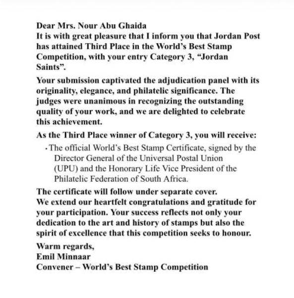 وأسفر هذا الفوز عن حصول البريد الأردني على شهادة "أفضل طابع في العالم” الرسمية، وهي شهادة مرموقة موقعة من المدير العام للاتحاد البريدي العالمي ونائب الرئيس الفخري لاتحاد هواة جمع الطوابع في جنوب أفريقيا، في تأكيد دولي جديد على جودة وتميز الطابع الأردني.