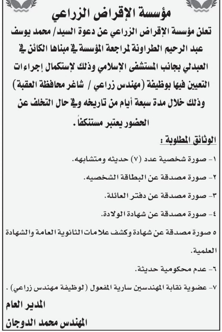 أعلنت مؤسسات حكومية اليوم الاربعاء، عن حاجتها لتعبئة وظائف حكومية شاغرة، فيما دعت مؤسسات اخرى اشخاصا لاستكمال اجراءات التعيين.