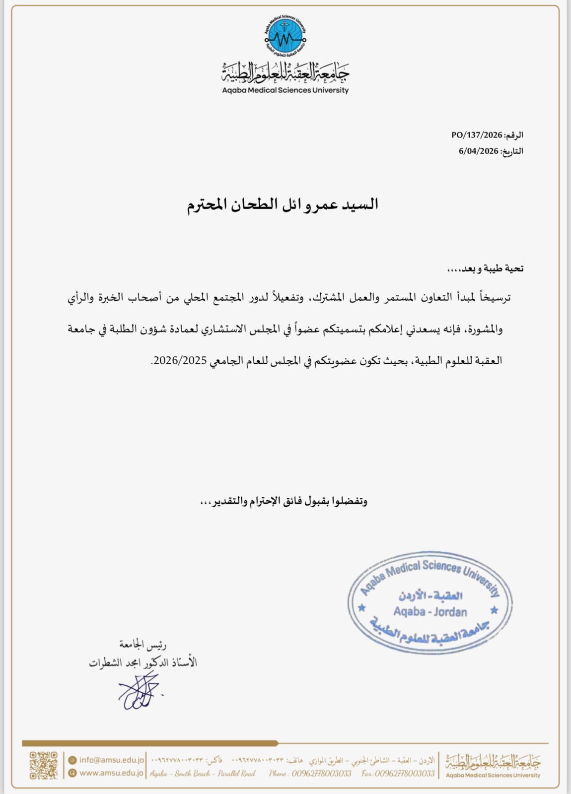 الطحان ينضم إلى المجلس الاستشاري في جامعة العقبة الطبية