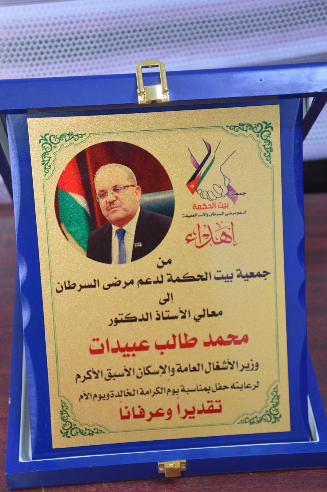وقام عبيدات وبدعوة من جمعية بيت الحكمة بتكريم الأطفال المرضى بالسرطان وأمهاتهم كسابقة من الجمعية لهؤلاء الأطفال وأمهاتهم ، وكذلك تكريم اللجنة العليا  وسيدات ورئيسات جمعيات في إربد ، وفي بداية اللقاء حيث تحدثت الأستاذة فايزة الزعبي مرحبة براعي الحفل والحضور و تحدثت عن الدور الذي تقوم به الجمعية من تقديم الدعم للأطفال المرضى بالسرطان على إمتداد العام وليس بالمناسبات فقط ، وكذلك تحدثت الزعبي عن يوم الكرامة الخالد الذي قدم فيه الجيش الأردني الباسل أسمى معاني البطولة والفداء ، وحقق أعظم انتصارات على أكبر جيش في التاريخ المعاصر الذي كان يسمى الجيش الذي لا يقهر ، ولكنه سقط أمام الآلة العسكرية الأردنية الباسلة ، ومن خلال حديثها قالت أم رائد أن الأم هي أساس الكرامة العالية الذي ربت وأعدت الجيل قبل أن يحمل السلاح والأم هي الذي قال عنها الشاعر :