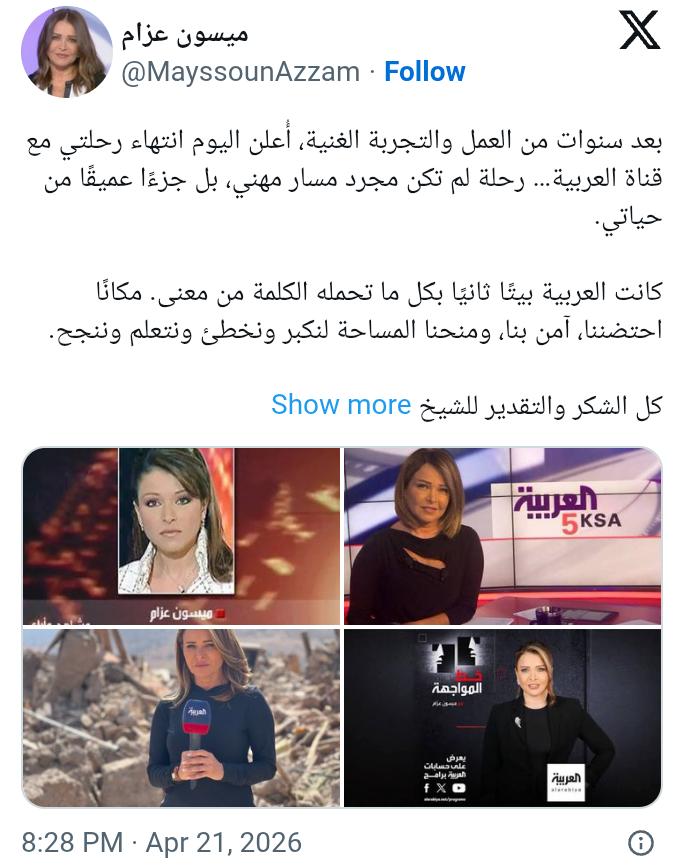 أعلنت الإعلامية البارزة ميسون عزام، انتهاء رحلتها المهنية مع قناة "العربية" بعد مسيرة حافلة استمرت لأكثر من عقدين، واصفة هذه التجربة بأنها لم تكن مجرد مشوار وظيفي، بل "جزء عميق ومؤثر" من حياتها الشخصية والمهنية.