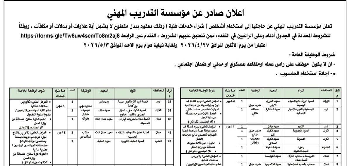 أعلنت مؤسسة التدريب المهني، اليوم الاثنين عن حاجتها لتعبئة وظائف شاغرة.