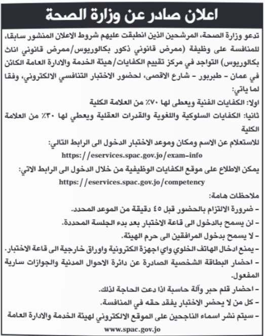 ودعت وزارة الصحة، المرشحين الذين انطبقت عليهم شروط الاعلان المنشور سابقا للامتحان التنافسي.